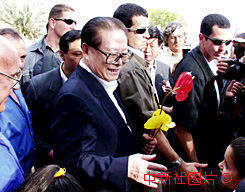江澤民主席十四日在以色列參觀類似中國“人民公社”的農莊——基布茲,接受兒童的獻花。中新社記者:彭偉祥