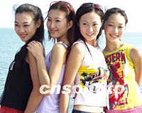 ![]() 戴安娜2001世界精英模特大賽中國預(yù)選賽暨金沙灘模特大賽十二日在青島金沙灘進(jìn)行外景拍攝。圖為參賽女模特身穿泳裝拍照。中新社記者 錢興強(qiáng) 攝