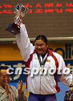 九運傳真:唐功紅榮登女子舉重新科“重量王” 2001年11月15日 19:12 ![]() 山東女子舉重選手唐功紅,15日在九運會女子舉重75公斤以上級比賽上力驚四座,以總成績312·5公斤獲得冠軍。中新社圖 洪少葵 攝