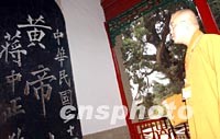 圖:佛指舍利迎歸團(tuán)參觀黃帝陵 2002年04月02日 09:38 ![]() 佛指舍利迎歸團(tuán)成員一日到陜西黃陵參觀黃帝陵。圖為寬池法師在軒轅廟中的蔣介石題詞前駐足。中新社圖 武仲林 攝