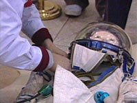 成功返回地球的“神舟”三號(hào)飛船返回艙在北京被打開,“模擬宇航員”在經(jīng)歷數(shù)百萬公里的太空旅行后安然無恙,圖為工作人員在檢查“模擬宇航員”。中新社