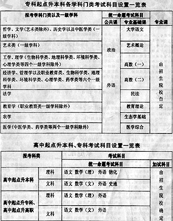 全國(guó)成人高考科目設(shè)置明年將作進(jìn)一步調(diào)整(附表) 2002年06月05日 16:09 ![]() 中新網(wǎng)北京6月5日消息:據(jù)中國(guó)教育報(bào)報(bào)道,為了使考試科目的設(shè)置更加適應(yīng)成人高等教育的特點(diǎn),更有利于提高成人高校招生的生源質(zhì)量和今后的培養(yǎng),有利于考試的組織和管理,從2003年起中國(guó)成人高校招生考試科目設(shè)置做進(jìn)一步的調(diào)整: 1.?破瘘c(diǎn)升本科統(tǒng)考科目按學(xué)科門類設(shè)置,不再按生源類別設(shè)置。統(tǒng)考科目為政治、外語(yǔ)和專業(yè)基礎(chǔ)課3門。專業(yè)基礎(chǔ)課根據(jù)各學(xué)科門類的特點(diǎn)設(shè)置8門(見(jiàn)?破瘘c(diǎn)升本科各學(xué)科門類考試科目設(shè)置一覽表),由招生院校按專業(yè)的需要規(guī)定考生應(yīng)試其中一門。 2.高中起點(diǎn)升專科(含高職)、高中起點(diǎn)升本科考試按文科、理科分別設(shè)置統(tǒng)考科目。其中,高中起點(diǎn)升?(含高職)統(tǒng)考科目為語(yǔ)文、數(shù)學(xué)(分文科類、理科類兩種,下同)、外語(yǔ)3門,主要考查考生是否具備接受高等?茖哟谓逃淖罨疽蟆?紤]到本科教育與專科教育培養(yǎng)目標(biāo)和教學(xué)要求的不同,報(bào)考高中起點(diǎn)升本科的統(tǒng)考科目的理科類考生增加一門“物理化學(xué)綜合課”(簡(jiǎn)稱物化),文科類考生增加一門“歷史地理綜合課”(簡(jiǎn)稱史地)(見(jiàn)高中起點(diǎn)升本科、?瓶荚嚳颇吭O(shè)置一覽表)。 3.各類考生除參加上述規(guī)定的統(tǒng)考科目考試外,招生院?筛鶕(jù)專業(yè)要求自行確定是否再加試一門考試科目。如需加試,招生院校必須在招生簡(jiǎn)章中注明并自行命題和組織考試,于錄取工作開始前,向有關(guān)省級(jí)成人高校招生辦公室提交加試合格考生名單。錄取時(shí),省級(jí)成人高校招生辦公室根據(jù)加試合格考生名單向招生院校投檔,招生院校根據(jù)考生參加統(tǒng)考的成績(jī),由高分到低分擇優(yōu)錄取(藝術(shù)類和體育類專業(yè)在考生文化課符合要求的基礎(chǔ)上,按加試專業(yè)課成績(jī)從高分到低分錄取)。不需加試的院校,按考生參加統(tǒng)考科目的成績(jī)錄取。 4.統(tǒng)考科目除?粕究瓶荚嚨拿穹ㄔ囶}由司法部命制外,其他試題均由教育部統(tǒng)一命制。各門試題滿分為150分;高中起點(diǎn)升本科、專科的統(tǒng)考科目每門考試時(shí)間為120分鐘,?粕究泼块T考試時(shí)間為150分鐘。