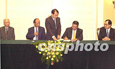 圖:澳門政府與銀河公司簽署博彩經(jīng)營批給合同 2002年06月27日 11:13 ![]() 澳門特區(qū)行政長官何厚鏵二十六日在澳門政府總部輿銀河娛樂場股份有限公司董事呂志和(左二)、范少朋(左一)簽署娛樂場幸運博彩經(jīng)營批給合同。中新社記者 李剛 攝