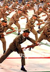 圖:駐港部隊(duì)“刺殺團(tuán)體操”為軍樂(lè)團(tuán)表演添彩 2002年07月06日 20:06 ![]() 七月六日晚,解放軍駐港部隊(duì)參加中國(guó)人民解放軍軍樂(lè)團(tuán)在香港的演出,他們表演的“刺殺團(tuán)體操”威風(fēng)凜凜,為軍樂(lè)團(tuán)演出錦上添花。潘索菲 攝