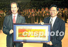![]() 中國(guó)人民解放軍軍樂(lè)團(tuán)八日晚在澳門(mén)綜藝館舉行盛大演出,澳門(mén)娛樂(lè)旅游有限公司董事總經(jīng)理何鴻燊向軍樂(lè)團(tuán)贈(zèng)送澳門(mén)全景畫(huà)框。李剛 攝