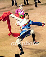 ![]() 中國(guó)人民解放軍樂(lè)團(tuán)八日在澳門(mén)綜藝館演出活潑歡快的藏族舞蹈。李剛 攝