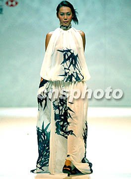 圖:港時裝節(jié)展示鄧達(dá)智的“水墨畫”女裙 2002年07月12日 10:11 ![]() “2003香港春夏時裝節(jié)”7月10日晚舉行香港十位頂尖設(shè)計(jì)師作品展示,模特身著設(shè)計(jì)師鄧達(dá)智的一件上繪墨竹全白透明沙裙款款款而行,宛如一幅流動的中國水墨國畫。任晨鳴 攝