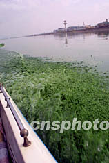 圖:昆明滇池個(gè)別水域綠藻泛濫 2002年07月16日 19:27 ![]() 昆明滇池個(gè)別水域最近綠藻泛濫,污染嚴(yán)重?焱я傔^(guò)時(shí)激起綠色的浪花,臭氣熏天。中新社記者 史利 攝