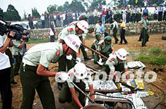組圖:云南銷毀一批假冒軍車和假牌照假印章 2002年07月22日 20:52 ![]() 銷毀現(xiàn)場(chǎng) ![]() 銷毀假冒軍車現(xiàn)場(chǎng) ![]() 銷毀假冒牌照現(xiàn)場(chǎng) 22日下午,云南省銷毀假冒軍警車輛現(xiàn)場(chǎng)會(huì)在昆明市小板橋洋浦頭舉行,共銷毀了四十多輛假冒軍用車輛,以及一批假冒軍用牌照和印章。該省近年共查獲假冒軍人案三百一十多起、假冒軍隊(duì)企業(yè)三十一家、假冒軍車達(dá)二百二十六輛。