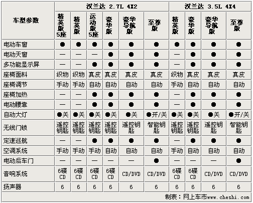 漢蘭達(dá)身為一款中高級SUV車型,所以在豪華配置上還是比較全面的,除了精英型車型外,其它車型的座椅都是真皮材質(zhì)的,而且還配備了座椅電動調(diào)節(jié)、加熱和電動腰靠,大大提升的漢蘭達(dá)的品質(zhì)。國產(chǎn)漢蘭達(dá)的全系車型都配備了6喇叭的音響系統(tǒng),高配車型配有DVD影音系統(tǒng)。頂配車型的尾門為電動開啟和關(guān)閉,大大的方便乘客使用。