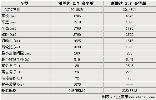 國產(chǎn)漢蘭達和現(xiàn)代新勝達均屬于一個級別的城市SUV車型,兩款車型均是2.7排量的高配車型,售價相差了4200元。在車身尺寸方面,國產(chǎn)漢蘭達在車長、車寬、均超過了現(xiàn)代新勝達,這一點保證了其內(nèi)部橫向空間及頭部空間的寬敞。在軸距方面,豐田漢蘭達比新勝達長出了90mm,這一點意味著漢蘭達的腿部空間將會優(yōu)越于新勝達。兩款車型的離地空間都達到了203mm,確保了它們在復(fù)雜路面上的道路通過性。越野性能方面,國產(chǎn)漢蘭達要優(yōu)越于新勝達,這點從接近角和離去角的數(shù)據(jù)就可以看出來。豐田漢蘭達的前后輪距和輪胎橫截面數(shù)據(jù)都要大于新勝達,這表明在操控性能上漢蘭達將會略勝一籌。漢蘭達和新勝達的油箱均達到了75升上下,可以為其提供良好的續(xù)航能力。