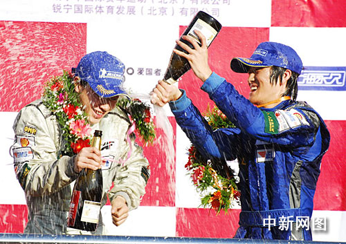EMS車隊張志強-崔岳互噴香檳慶祝