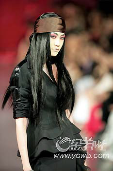 Dior2006-2007秋冬秀場的模特讓人印象深刻的,除了設(shè)計夸張的墨鏡外,人人都有一頭如旗幟般飄逸柔順的長直發(fā),統(tǒng)統(tǒng)包裹在紫褐色頭巾下,很有上世紀80年代的懷舊感。但更重要的是,每件衣服都暗含硬朗的符號,就像模特們脫掉墨鏡之后,露出詭異的紅色眼妝一樣,她們似乎都在堅定地走不妥協(xié)路線。