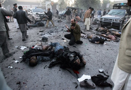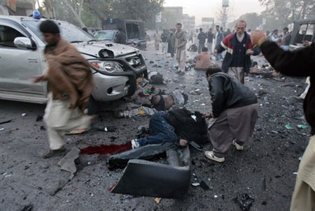 中新網(wǎng)12月27日電 據(jù)法新社報(bào)道,道巴基斯坦前總理貝-布托今日在競選集會(huì)上遭到炸彈襲擊,不治身亡。圖為爆炸現(xiàn)場(chǎng)。