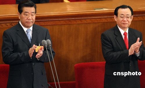 3月14日上午,全國政協(xié)十一屆一次會議在北京人民大會堂閉幕,全國政協(xié)主席賈慶林、副主席王剛(右)等出席。中新社發(fā) 任晨鳴 攝