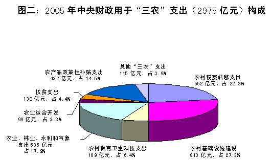(二)大力支持解決“三農(nóng)”問(wèn)題,促進(jìn)城鄉(xiāng)協(xié)調(diào)發(fā)展。2005年財(cái)政支持“三農(nóng)”繼續(xù)保持了力度大、政策實(shí)、措施強(qiáng)的特點(diǎn)。全年僅中央財(cái)政用于“三農(nóng)”的支出就達(dá)2975億元,比2004年實(shí)際執(zhí)行數(shù)增加349億元,增長(zhǎng)13.3%。一是不斷深化農(nóng)村稅費(fèi)改革。中央財(cái)政為此轉(zhuǎn)移支付662億元,比2004年增長(zhǎng)26.3%。2005年,牧業(yè)稅和除煙葉外的農(nóng)業(yè)特產(chǎn)稅已全部免征;免征農(nóng)業(yè)稅的省份達(dá)到28個(gè),8億農(nóng)民受益。二是認(rèn)真落實(shí)“三補(bǔ)貼”等政策。全國(guó)30個(gè)省份用于糧食直補(bǔ)的資金達(dá)到132億元,比2004年增長(zhǎng)13.8%。兌付良種補(bǔ)貼資金38.7億元,比2004年增長(zhǎng)35.8%。中央財(cái)政兌付農(nóng)機(jī)具購(gòu)置補(bǔ)貼資金3億元,是2004年的4倍多。另外,落實(shí)專項(xiàng)資金55億元,對(duì)產(chǎn)糧大縣予以財(cái)力補(bǔ)助;對(duì)企業(yè)生產(chǎn)銷售的尿素免征增值稅,運(yùn)用關(guān)稅政策鼓勵(lì)進(jìn)口國(guó)內(nèi)短缺的農(nóng)業(yè)生產(chǎn)資料。調(diào)動(dòng)了地方政府重農(nóng)抓糧的積極性,維護(hù)了糧食安全。三是支持農(nóng)業(yè)和農(nóng)民長(zhǎng)遠(yuǎn)發(fā)展。2005年中央財(cái)政用于農(nóng)業(yè)農(nóng)村基礎(chǔ)設(shè)施建設(shè)的預(yù)算內(nèi)基本建設(shè)投資和國(guó)債項(xiàng)目資金達(dá)812.78億元,進(jìn)一步改善了農(nóng)村生產(chǎn)生活條件。中央財(cái)政用于農(nóng)業(yè)綜合開(kāi)發(fā)資金98.55億元,新增資金中76.6%用于糧食主產(chǎn)區(qū)中低產(chǎn)田改造的農(nóng)業(yè)基礎(chǔ)設(shè)施建設(shè)。同時(shí),積極探索采用投資參股、專項(xiàng)貼息等形式,更加有效地發(fā)揮農(nóng)業(yè)綜合開(kāi)發(fā)資金的引導(dǎo)、示范和帶動(dòng)效應(yīng)。中央財(cái)政支持280萬(wàn)農(nóng)村勞動(dòng)力轉(zhuǎn)移培訓(xùn),補(bǔ)助資金4億元,比2004年增長(zhǎng)60%。不斷增加用于扶貧開(kāi)發(fā)方面的投入,2005年達(dá)到130億元。中央財(cái)政安排資金251.7億元,直接補(bǔ)貼退耕還林的農(nóng)民。繼續(xù)大力支持農(nóng)業(yè)科技推廣、農(nóng)業(yè)產(chǎn)業(yè)化、農(nóng)民專業(yè)合作組織發(fā)展、小型農(nóng)田水利建設(shè)和測(cè)土配方施肥等。