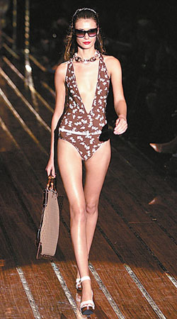 2006年春夏依然是一個(gè)花朵爛漫的季節(jié),不過(guò)去年流行的大花紋的暖色系泳裝卻被低調(diào)的細(xì)密碎花所替代,這源自于設(shè)計(jì)師們的鄉(xiāng)村生活體驗(yàn)。