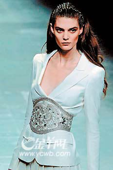 其實,軟塌塌的布料拿來做腰封,要么就被定型,塑造出稍為柔和的硬朗,要么則干脆用隨意的褶皺來突出層次感,兩者的要訣都是必須束緊,而后者往往更容易穿出富麗堂皇的高貴感覺。當(dāng)然,前提是你必須選擇那些具有反光效果的布料,如綢緞,要不就在腰帶中央別上一枚造型獨特的巨型寶石。除此之外,今年流行的富有民族色彩的串珠項鏈和手鐲都是必不可少的裝飾物。