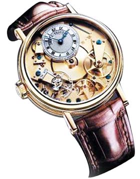 這款精美腕表的革命性設計在于,橋架、齒輪、擒縱機構、發(fā)條盒和零件均一目了然,而通常這些零件都是安裝在底板之下的,表的觀賞性得到巨大地提高。這是一款將超現(xiàn)代理念和傳統(tǒng)完美結合的表款:一絲不茍的規(guī)范,躍然眼前的擺輪在勻稱的橋架支撐下運轉有致,且因精美的裝飾而更加奪目。橋架和底板為噴砂處理,其所采用的修整技術需要非同一般的技巧,才能使之均衡平整,堅固耐用。這款精品體現(xiàn)了獨特的風格和全新的技藝,表明寶璣表在與時俱進的同時,不失其一如既往的純正和優(yōu)雅,絕不會偏離品牌的身份與本質。