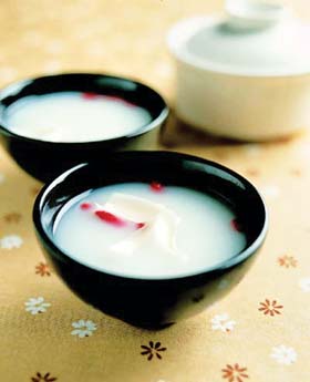 【原料】植脂淡奶20毫升、鮮百合20克、枸杞少許、水2杯、煉奶適量。