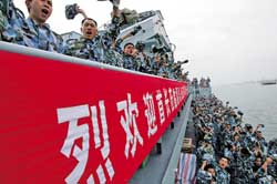 軍艦解纜離港的瞬間,列隊右甲板的官兵中間,突然爆發(fā)出一陣陣豪邁而又深情的呼喊:“戰(zhàn)友再見!親人再見!”喊聲如驚雷,滾過大海,躍上云霄,震撼心扉,令人動容。