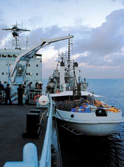 從清晨5時起,為永暑礁補(bǔ)給物資的工作就開始了。先是一艘拖船靠上我們的補(bǔ)給艦,然后補(bǔ)給艦上的吊車把各種物資一一吊裝到拖船上,甲板上一片忙碌。