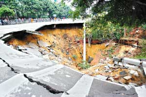 昨日下午4時(shí)許,記者來(lái)到事故現(xiàn)場(chǎng),窟窿剛好處于雙橋路和珠江大橋的引橋交界處, 面積大約有100平方米,深約5米。窟窿的邊緣,水泥的路面碎裂,讓人覺(jué)得隨時(shí)可能會(huì)掉進(jìn)里面。原本在路邊的一根路燈栽入了窟窿中,兩棵樹也陷了進(jìn)去。警方在現(xiàn)場(chǎng)拉起了警戒線,地鐵公司等相關(guān)部門的工作人員正緊張?zhí)幚怼?/p>