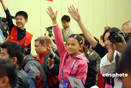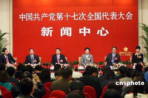 十月二十日晚,出席中共十七大的國(guó)家文化部副部長(zhǎng)于幼軍、教育部副部長(zhǎng)袁貴仁、全國(guó)婦聯(lián)副主席黃晴宜、共青團(tuán)中央書記處第一書記胡春華、國(guó)家廣播電影電視總局副局長(zhǎng)趙實(shí)等代表就未成年人教育問(wèn)題,在北京梅地亞中心接受中外媒體采訪。中新社發(fā) 毛建軍 攝