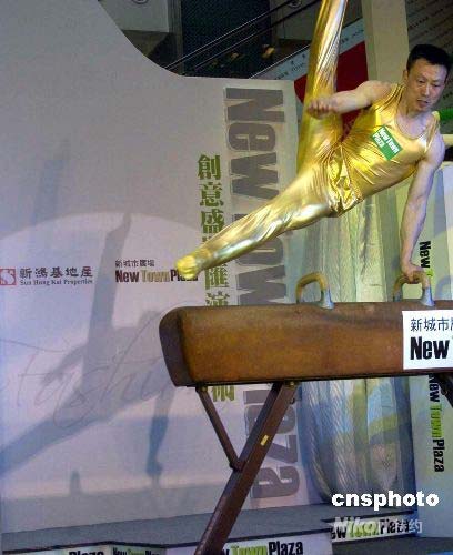四月三十日,沙田一商場為慶祝奧運馬術比賽在香港舉行,特別邀請亞特蘭大奧運會鞍馬冠軍李東華作表演。李東華作為瑞士2008年奧運會國家代表團的特使,為瑞士贏得近百年來的首枚體操奧運金牌。中新社發(fā) 譚達明 攝