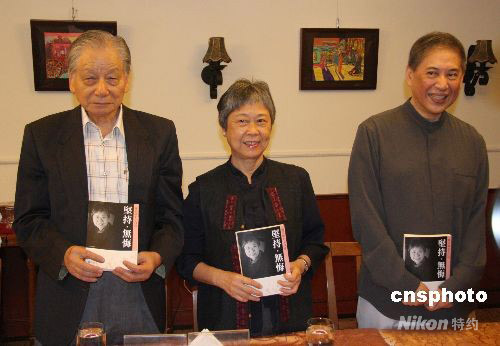 九月三十日下午,女作家陳若曦(中)在臺北舉辦新著《堅持·無悔——陳若曦七十自述》出版發(fā)布會。著名作家白先勇(右)前來向當年臺大老同學祝賀。陳若曦一九三八年生于臺北縣中和,臺大外文系畢業(yè)后留學美國,獲約翰霍普金斯大學寫作系碩士。一九六六年與丈夫回到中國大陸,一九七三年到香港居住,先后移居加拿大、美國,近年定居臺北。其作品曾被譯為英、德、日、法、挪威等文字。中新社發(fā) 耿軍 攝