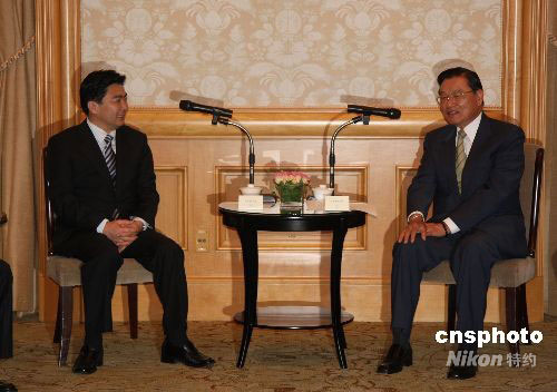 臺灣海基會董事長江丙坤(右)十月一日在臺北西華飯店會見前來臺灣參訪的中共江蘇省委常委、蘇州市委書記王榮。經(jīng)常到蘇州看望臺商的江丙坤,希望蘇州在中小臺資企業(yè)融資、勞動合同法的實(shí)施及臺資企業(yè)后續(xù)發(fā)展的土地三個問題上,更多地向臺商提供輔導(dǎo)和協(xié)助。中新社發(fā) 耿軍 攝