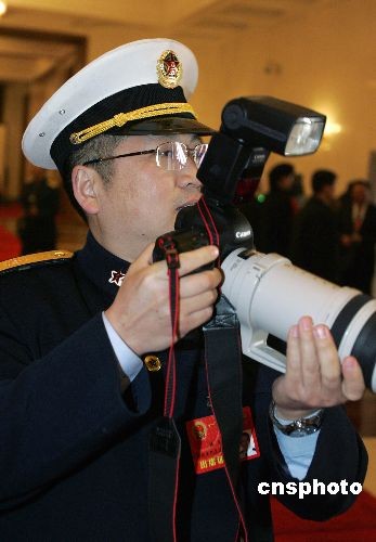 3月10日上午,十一屆全國人大一次會議在北京人民大會堂舉行第三次全體會議,精通攝影的全國人大代表、新晉海軍少將汪玉為出席會議的解放軍代表團拍照。汪將軍系海軍裝備研究院某研究所副所長兼總工程師。中新社發(fā) 任晨鳴 攝