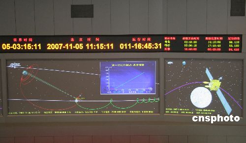 北京時間11月5日11時37分,北京航天飛行控制中心對“嫦娥一號”衛(wèi)星成功實施了第一次近月制動,順利完成第一次“太空剎車減速”動作,月球捕獲衛(wèi)星。“嫦娥一號”順利進入環(huán)月軌道,成為中國第一顆月球衛(wèi)星。中新社發(fā) 孫自法 攝