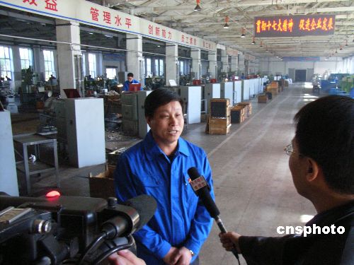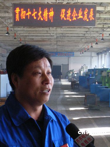 10月22日,齊齊哈爾建華公司黨委書記在接受采訪。當(dāng)日,中國共產(chǎn)黨第十七屆中央委員會(huì)第一次全體會(huì)議勝利閉幕。國家老工業(yè)基地齊齊哈爾市的產(chǎn)業(yè)工人非常高興,中國兵器工業(yè)集團(tuán)公司齊齊哈爾建華公司黨委書記谷云龍代表全體員工表示:堅(jiān)決擁護(hù)十七大的各項(xiàng)決議,擁護(hù)新一屆中央領(lǐng)導(dǎo)集體,緊密地團(tuán)結(jié)在黨中央周圍,不斷增強(qiáng)自主創(chuàng)新能力,為國家發(fā)展,社會(huì)和諧人民進(jìn)步多做貢獻(xiàn)。中新社發(fā) 王云龍 攝