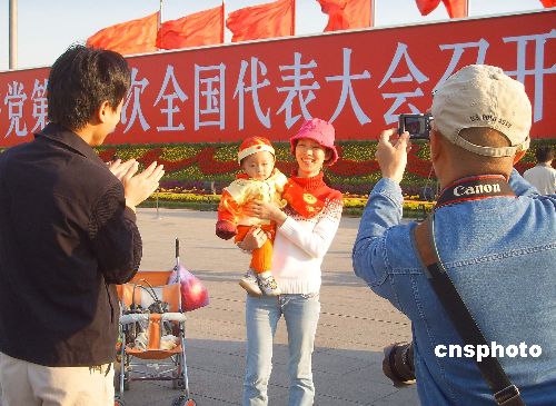 10月21日上午,黨的“十七大”在北京勝利閉幕,來自四面八方的游客感到無比高興、鼓舞,紛紛快樂地在花團錦簇的北京天安門廣場拍照留影,記錄下這有意義的時刻。中新社發(fā) 玉龍 攝