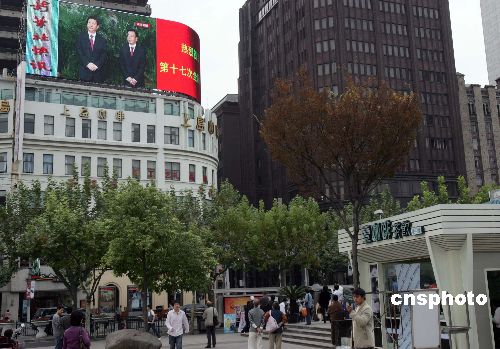 十月二十二日,上海南京路一個電子大屏幕直播北京人民大會堂新一屆中央政治局常委與中外記者見面實(shí)況,吸引上海市民駐足觀看。中新社發(fā) 潘索菲 攝