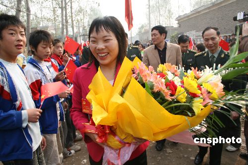10月23日,出席黨的十七大的河南代表團(tuán)代表吳新芬回到家鄉(xiāng)禹州市朱閣鄉(xiāng)邊樓村,受到家鄉(xiāng)父老的熱情歡迎,當(dāng)日她就把黨的十七大的精神與鄉(xiāng)親們分享。十七大代表吳新芬,是一名來自河南省禹州市朱閣鄉(xiāng)邊樓村的軍人媳婦。1998年,大學(xué)畢業(yè)不久,當(dāng)她得知西藏某部邊防軍官王俊景在執(zhí)行任務(wù)時被高壓電擊成重傷,便毅然辭去工作,跑到醫(yī)院照顧,不久后兩人成為伴侶。此后10年,她和丈夫共用一雙手,一起跨越常人難以想象的重重困難,艱苦而幸福地生活。中新社發(fā) 牛書培 攝