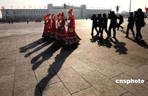 三月五日上午九時,十一屆全國人大一次會議在北京人民大會堂隆重開幕。攝影記者在天安門廣場窮追不舍拍攝穿著少數民族服飾的亮麗女服務員。中新社發(fā) 廖攀 攝