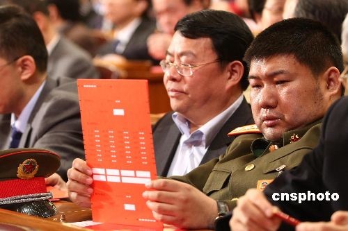 3月13日下午,全國政協(xié)十一屆一次會議在北京人民大會堂舉行第四次全體會議,選舉賈慶林為新一屆政協(xié)主席,王剛等二十五人為副主席,錢運錄兼任秘書長,同時選舉產(chǎn)生二百九十八名政協(xié)常委。圖為毛澤東之孫毛新宇委員(右)在投票前細覽選票。中新社發(fā) 盛佳鵬 攝