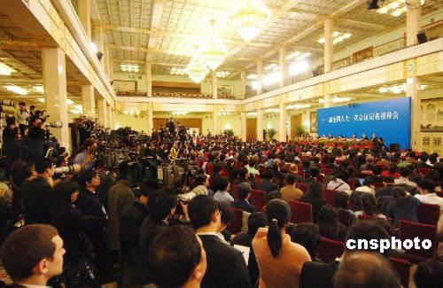 3月18日上午,十一屆全國(guó)人大一次會(huì)議在北京人民大會(huì)堂閉幕,國(guó)務(wù)院總理溫家寶于會(huì)后率李克強(qiáng)、回良玉、張德江、王岐山四位副總理會(huì)見(jiàn)中外記者。中外媒體云集總理記者會(huì)。中新社發(fā) 王東明 攝