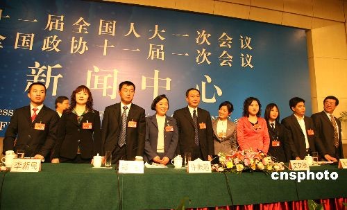 三月六日,十一屆全國(guó)人一次會(huì)議新聞中心舉行首場(chǎng)集體采訪,十位來自基層的全國(guó)人大代表亮相。他們中除一名是導(dǎo)游、一名是教師外,其他均為工人、農(nóng)民代表。中新社發(fā) 吳慶才 攝
