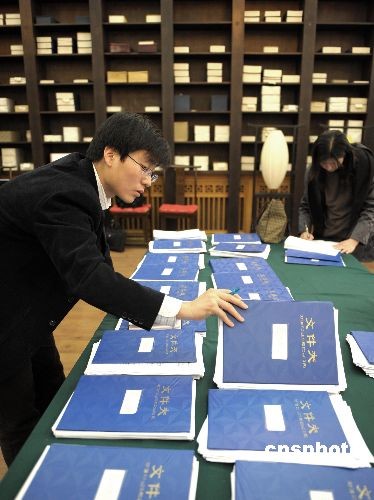 全國政協(xié)十一屆一次會議委員提案接收工作于三月九日下午兩點截止,據(jù)統(tǒng)計,共收到委員提案4772件。圖為大會提案組辦公室工作人員在清點提案。中新社發(fā) 廖攀 攝