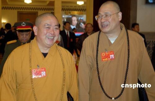 3月10日上午,十一屆全國人大一次會議在北京人民大會堂舉行第三次全體會議,中國佛教協(xié)會副會長、河南省佛教協(xié)會會長、河南省少林寺方丈釋永信(左),中國佛教協(xié)會常務副會長、湖南省佛教協(xié)會會長釋圣輝共同出席。中新社發(fā) 劉萬強 攝