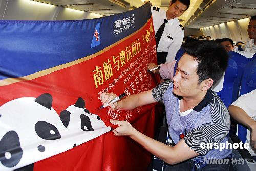4月30日,北京奧運(yùn)倒計時100天,南航廣州——貴陽的CZ三四一一、CZ三四一二航班上,“南航與奧運(yùn)同行與冠軍同飛 南航旅客支持奧運(yùn)百萬人大簽名”活動拉開序幕。中新社發(fā) 陳衛(wèi)華 攝