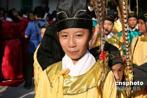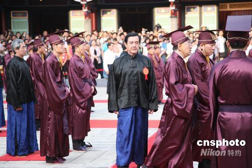 晨六時,天放亮,“鼓三嚴(yán)”,祭典依舊制開始。著褐色古袍的引領(lǐng)人員引領(lǐng)“主獻(xiàn)官”臺北市長郝龍斌及“分獻(xiàn)官”、“陪祭官”等入場,郝龍斌及作為“分獻(xiàn)官”、“陪祭官”的十幾位臺北優(yōu)秀教師和各界代表,著藍(lán)色長袍,黑色馬褂,依次走向固定位置佇立。