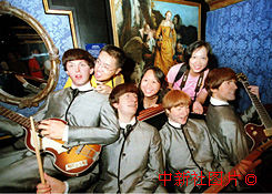 即將開放的“香港杜莎夫人蠟像館”28日向新聞界預(yù)展,披頭士樂隊的樂迷與逼真的蠟像合影留念。中新社傳真洪少葵攝