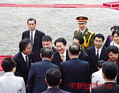 朱镕基總理與出席歡迎儀式的日方官員握手 2000年10月14日 10:09 ![]()