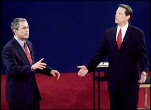 圖文:戈爾與布什最后一場電視辯論火藥味十足 2000年10月18日 13:52 ![]() 兩人在辯論中手舞足蹈,火藥味十足(據(jù)外電) 中新網(wǎng)香港10月18日消息:美國總統(tǒng)候選人戈爾及喬治布什,結(jié)束在選舉前最后一場電視辯論,為爭取游離票作最后努力。 兩人一改過往兩場辯論較禮讓的表達方式,互相狠批對方政策上的錯誤。而最新民意調(diào)查結(jié)果顯示,戈爾的表現(xiàn)略勝一籌。 美國有線電視新聞網(wǎng)絡(luò)進行的及時民調(diào)顯示,46%的受訪者認為戈爾的表現(xiàn)優(yōu)于喬治布什,44%的受訪者認為喬治布什的表現(xiàn)較佳。 今次辯論在圣路易市的華監(jiān)頓大學(xué)議事廳舉行,歷時90分鐘。而今次與前兩次不同的地方,是140名仍未決定選任何人的觀眾,直接向兩名候選人提問。而今次辯論的主要事項,除了外交外,亦會討論到醫(yī)療、教育及稅務(wù)等問題。兩名候選人都在辯論前,為在空難中喪生密蘇里州州長卡納漢默哀。 對經(jīng)歷過不下一千次非正式辯論的戈爾,在辯論開始后,駕輕就熟地走到臺前,刻意與臺下觀眾拉近距離,保持一貫親民形象。鑒于在第二次辯論中,被人批評他對布什的態(tài)度過分溫和,戈爾今次主動出擊,率先狠批布什的醫(yī)療計劃。戈爾指喬治布什,未有支持一項提交國會的醫(yī)療法案建議,并指摘布什在保障病人權(quán)益上態(tài)度消極,說一套做一套。 而布什亦不甘示弱,強調(diào)自己是支持病人權(quán)利法案,并強調(diào)為了人民利益,愿意放下歧見,愿意與民主黨合作,共同把政策發(fā)展得最好。 另外,戈爾在辯論中又標(biāo)榜過去8年民主黨執(zhí)政期間的經(jīng)濟突出表現(xiàn),并直接喬治布什支持削減富庶家庭稅項的政策,強調(diào)他只會支持削減中等家庭稅收的建議。另外,戈爾亦向觀眾自夸在外交及政治上才能,包括在參眾兩院多年的經(jīng)驗,令他在軍備控制及外交具豐富經(jīng)驗。 而喬治布什就公開質(zhì)疑戈爾的誠信,認為他當(dāng)選后,會維持現(xiàn)有的大政府思想,與民眾完全脫節(jié)。 辯論結(jié)束后,路透社實時訪問了6名政治分析家,其中5人均認為戈爾在辯論中較喬治布什優(yōu)勝。分析家認為,戈爾的說話,在形式以包裝均能取悅觀眾,而他的身體語言,包括盡量站在觀眾席前,均能表現(xiàn)親民作風(fēng)。 相反地,喬治布什保持他一貫呆立的作風(fēng),經(jīng)常站在臺中間發(fā)言,亦令他損失一些分數(shù)。而他不肯定的語句,及帶點“口吃”的表達方式,亦是他失分的主要原因。 不過,兩間電視臺進行的民意調(diào)查顯示,雖然兩人的支持率相當(dāng)接近,但喬治布什輕微領(lǐng)先戈爾2至6個百分點。另外,民意調(diào)查亦顯示,仍然有7 %選民未決定取向,而有17%人表示,在選舉當(dāng)日仍有機會改變主意。(據(jù)TVB) 相關(guān)報道:圖文:戈爾及布什第三輪電視辯論開始 相關(guān)報道:戈爾和小布什今天進行最后一場電視辯論 相關(guān)報道:三項最新民調(diào)均顯示,布什繼續(xù)領(lǐng)先戈爾 相關(guān)報道:調(diào)查顯示小布什第二輪電視辯論表現(xiàn)佳 相關(guān)報道:美國選民認為喬治布什比戈爾誠實 |