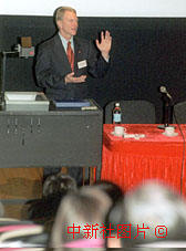 ‘曾三次執(zhí)行太空穿梭機(jī)特別飛行任務(wù)的美國(guó)太空人尼爾遜博士,十月二十一日在香港科學(xué)館舉行的“二十一世紀(jì)科學(xué)及科技教育透視”研討會(huì)上作演講。中新社傳真 任海霞攝
