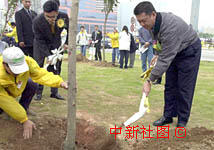 何厚鏵為回歸一周年植樹(橫片)。為慶祝澳門回歸一周年,特區(qū)行政長官何厚鏵十七日在蓮花廣場附近種下一棵紀念樹。中新社傳真 宗金柱攝